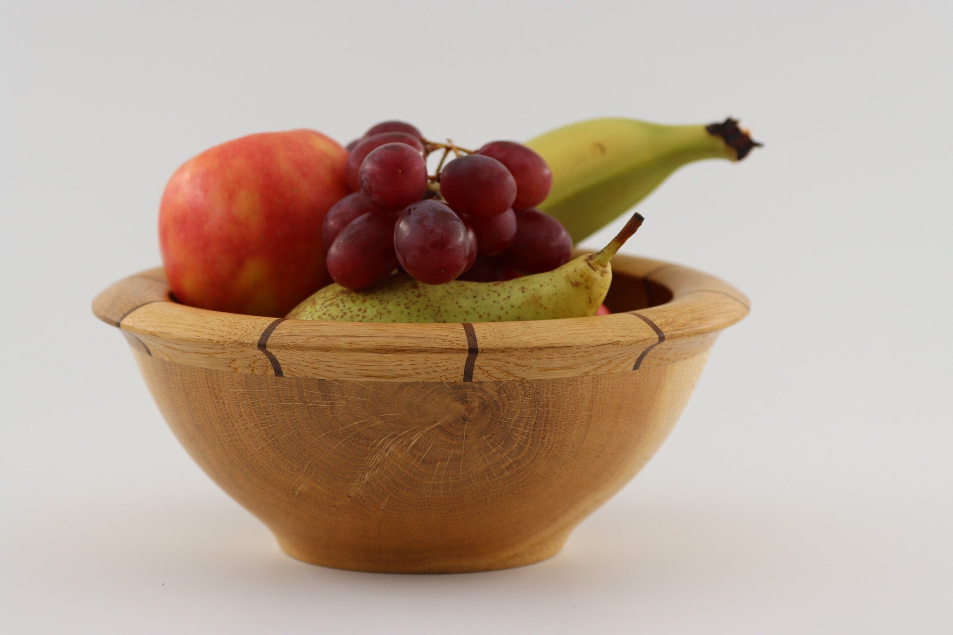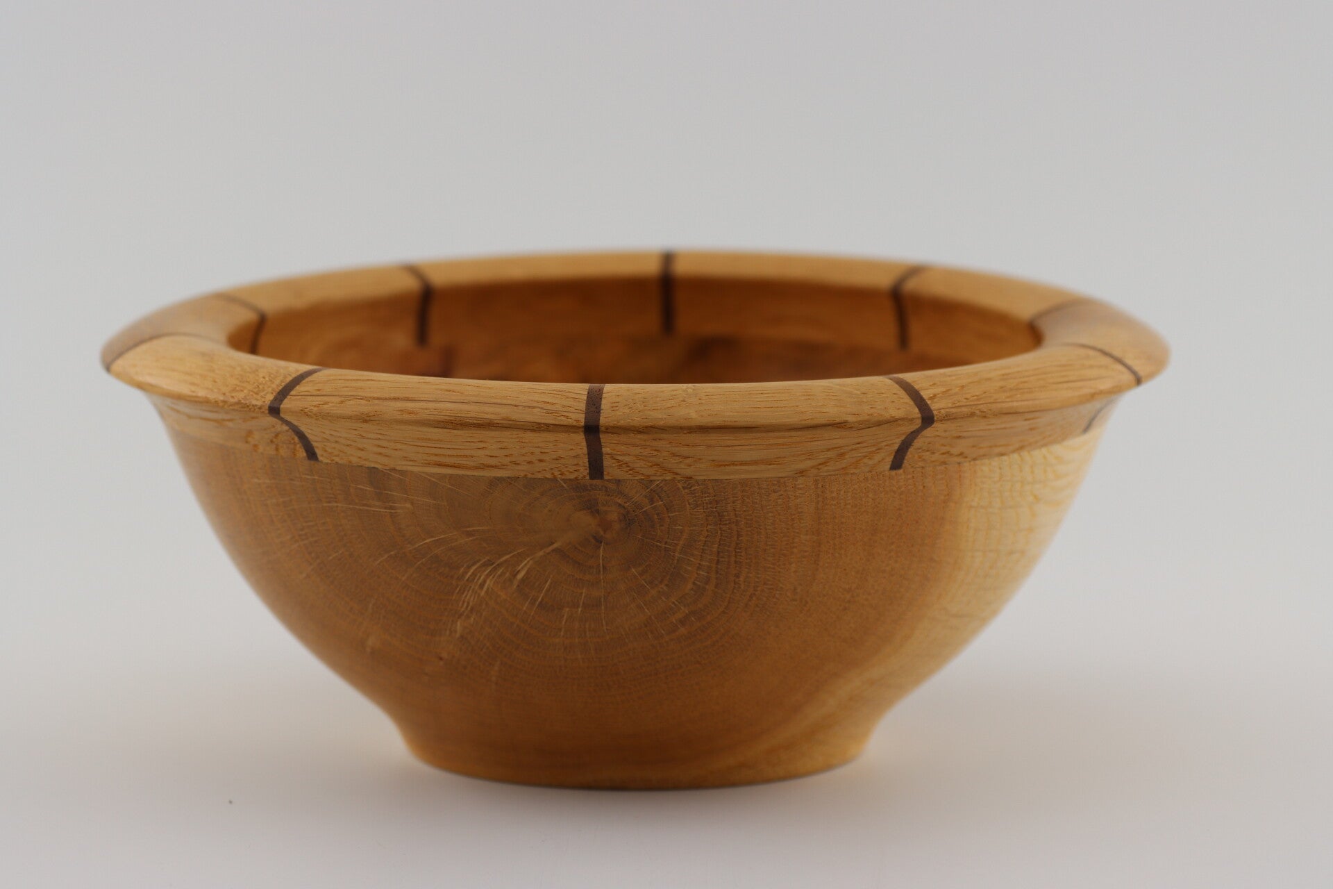 Schaal gedraaid uit Europees eikenhout met notenhouten inlegwerk in de rand. voedselveilig dus kan voor van alles gebruikt worden zoals fruit of chips of wat dan ook.