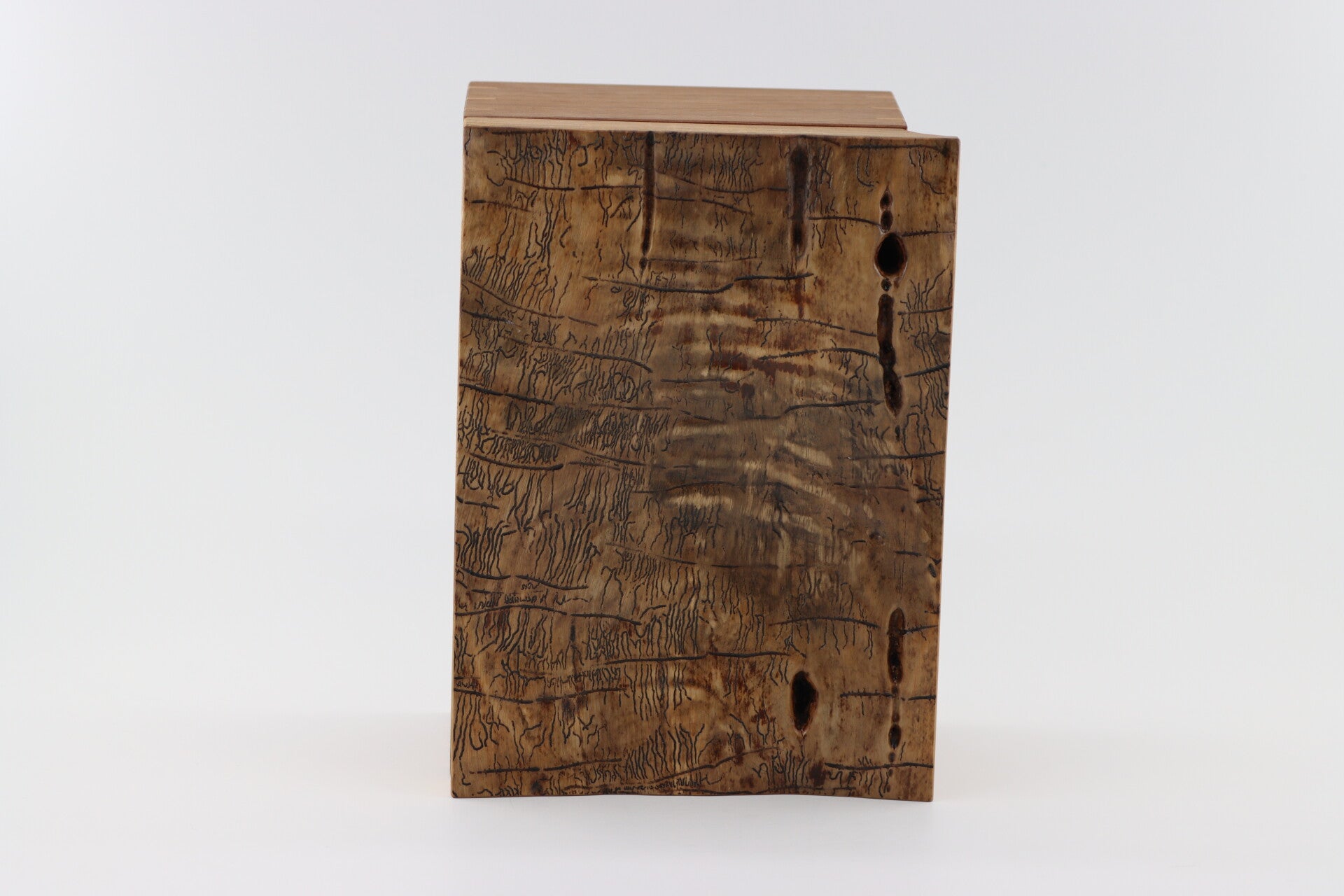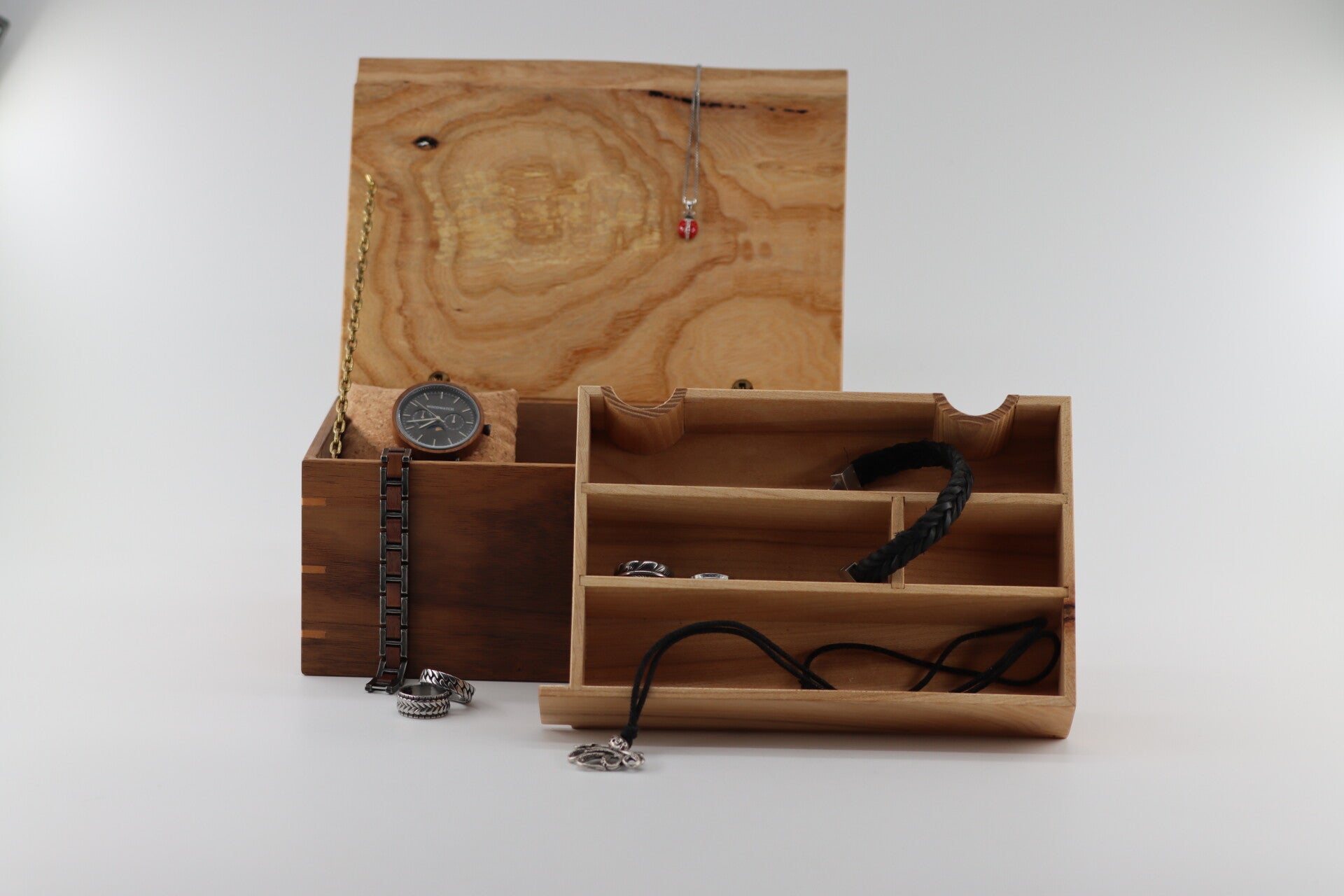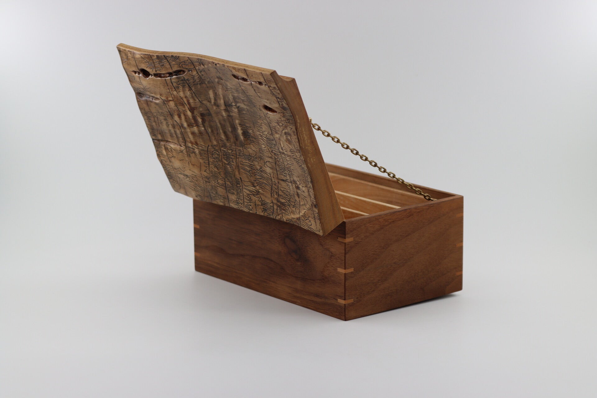 Unieke juwelen kist van Notenhout met een deksel uit Essen hout. De "gravure" in de deksel zijn boorgangetjes van schorskevertjes die tussen de bast en de stam geleefd hebben! Dit geeft de deksel een unieke uitstraling. De Deksel blijft openstaan met behulp van een mooi ketting en heeft unieke scharnieren. Als je echt iets aparts en unieks wil voor je kostbaarheden. De inleg tray in gemaakt van Beuken hout en uitneembaar. Zo heeft u dus twee lagen om uw kostbaarheden in op te bergen.