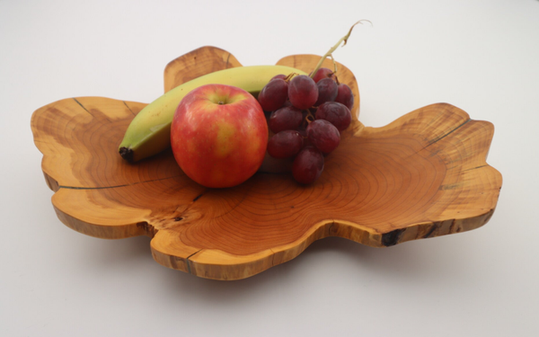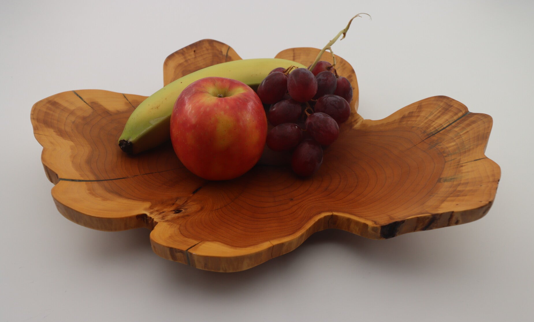 Schaal gedraaid uit Taxushout. Met een natuurlijke buitenrand echt uniek. De scheuren zijn opgevult met groene Epoxy