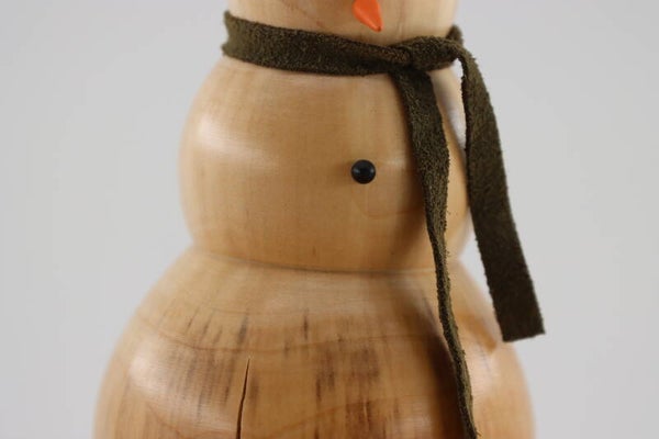 Leuke sneeuwpop gedraaid uit wilgenhout uit één stuk. Met een leuk donkergroen sjaaltje van echt leer.
