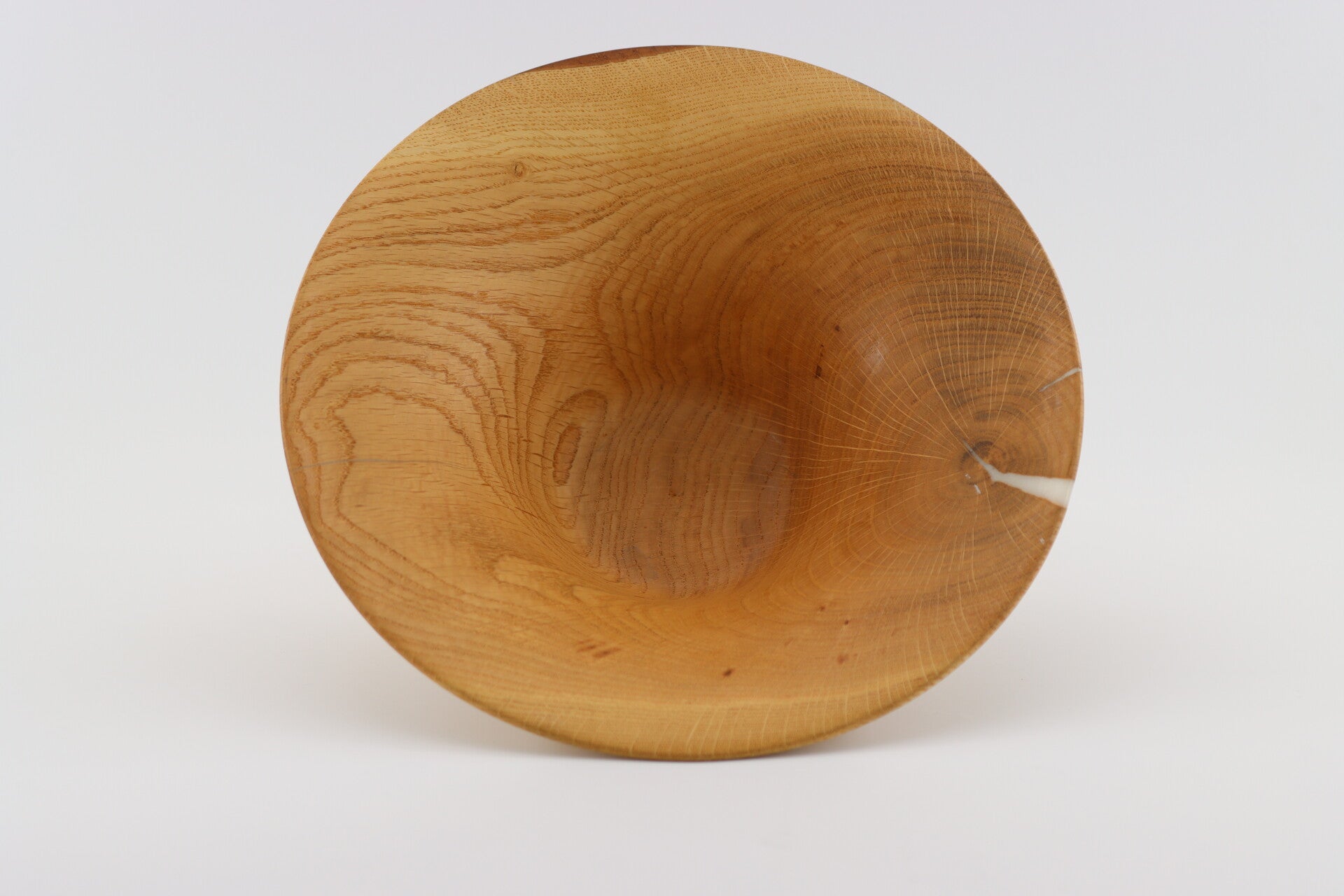 Mooie schaal in een trompet model uit europees eikenhout. En opgevuld met witte epoxy. Erg leuk model en voedsel veilig een echte blikvanger op uw tafel.