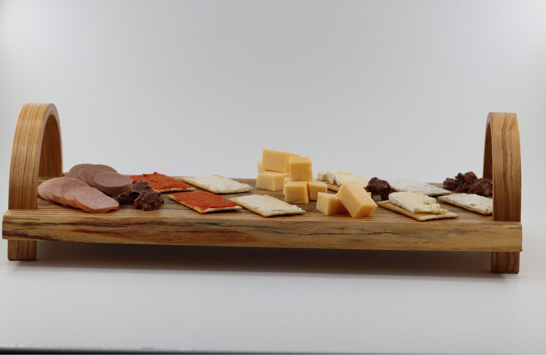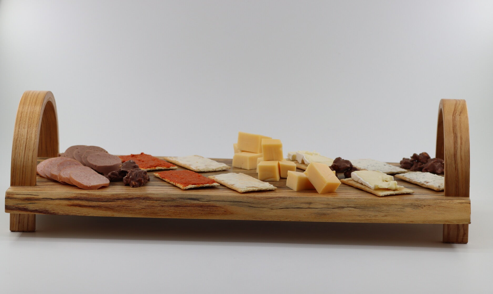 Tapas, hapjes serveerplank gemaakt van Hemelboomhout met gebogen handvaten uit Essenhout