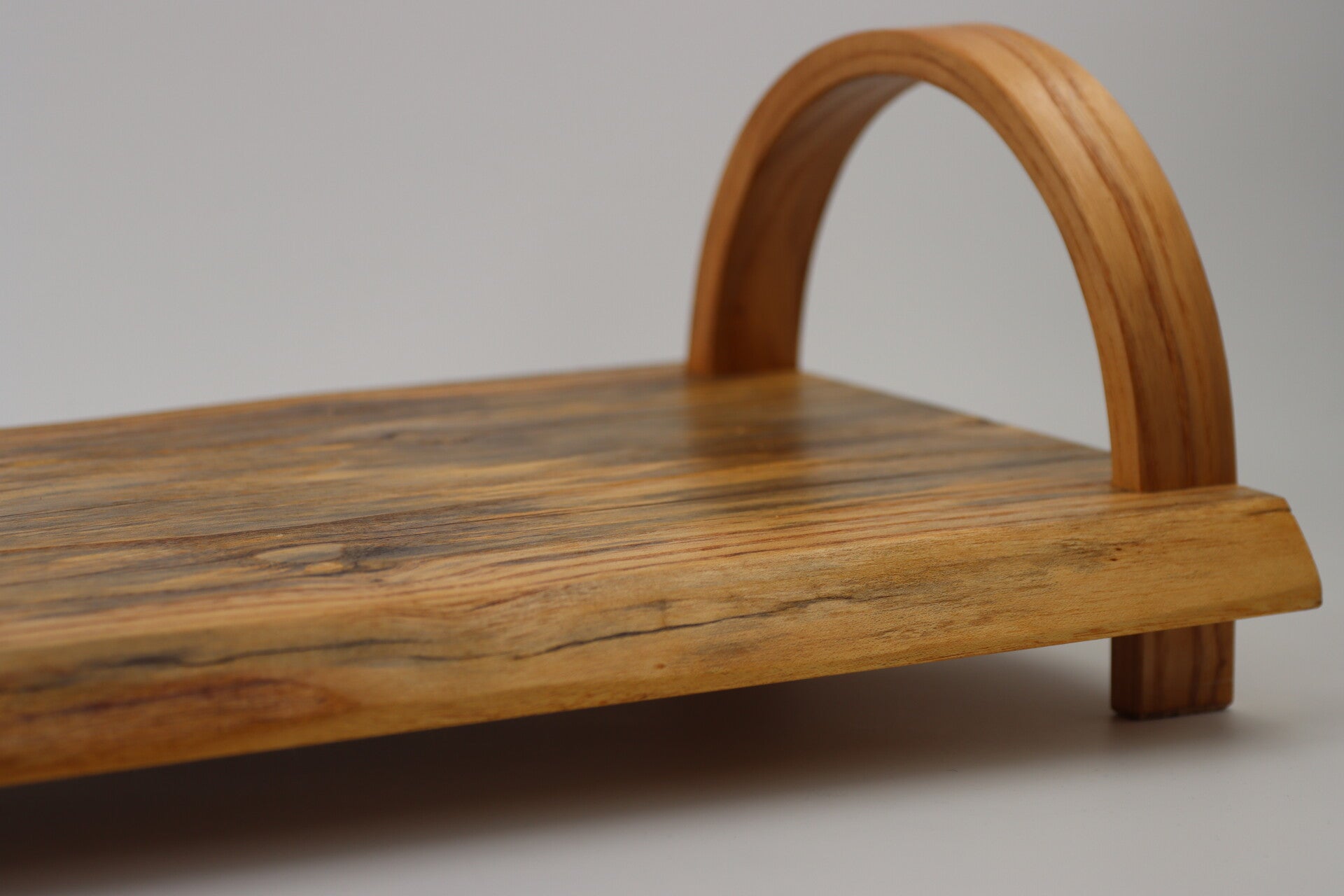 Deze unieke serveerplank is gemaakt van hemelboom hout, de handvaten zijn gemaakt uit essen hout en door middel van stoom gebogen.